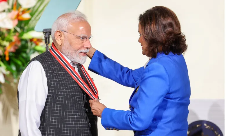 Port of Spain, July 4 – In a landmark moment, Prime Minister Narendra Modi became the first foreign leader to be awarded the Order of the Republic of Trinidad and Tobago (ORTT)—the nation’s most prestigious civilian award. President Christine Kangaloo presented the honour at the Presidential Palace, recognising Modi’s influential global leadership, his strong engagement with the Indian diaspora, and his humanitarian contributions during the COVID-19 crisis.